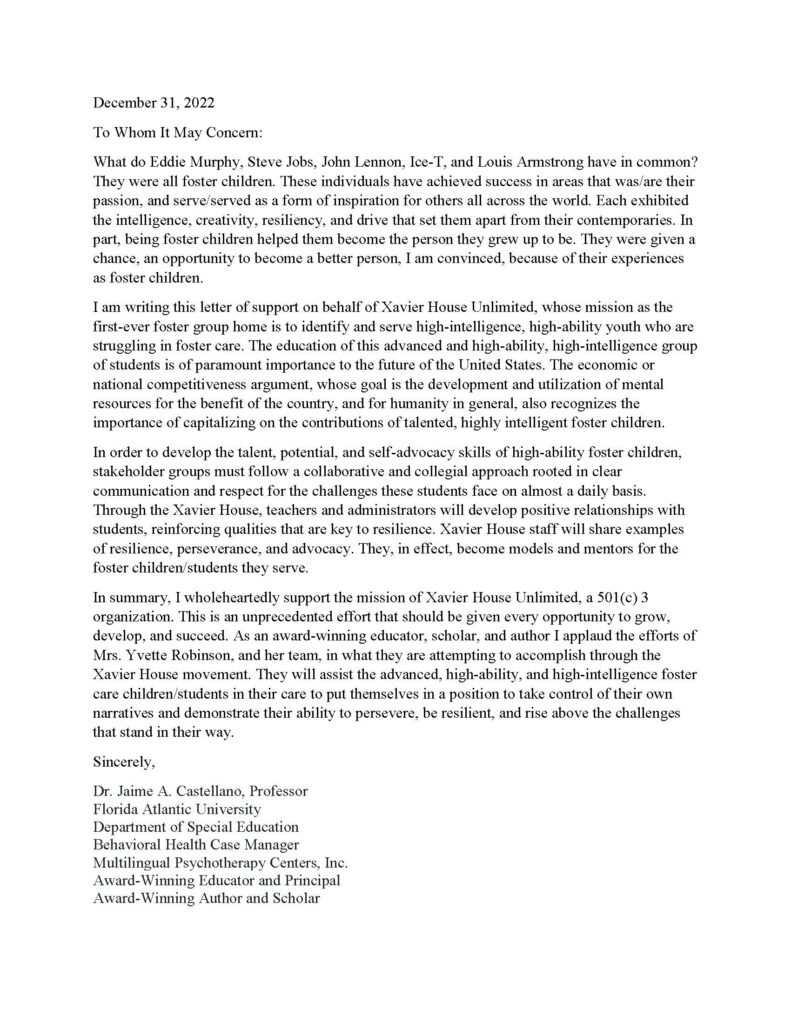 View Letter of Support from Dr. Jaime A. Castellano, Professor